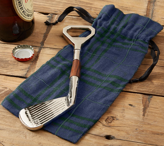 Golf Club Bottle Opener in Plaid Gift Pouch - Brass/Mango Wood