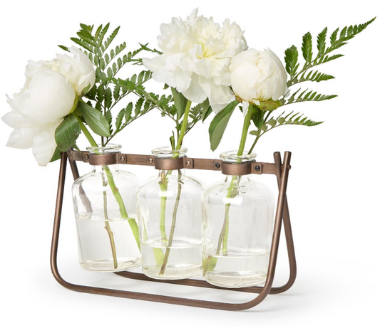 Hinged Flower Arranger with 3 Glass Bottle Vases on Metal Stand