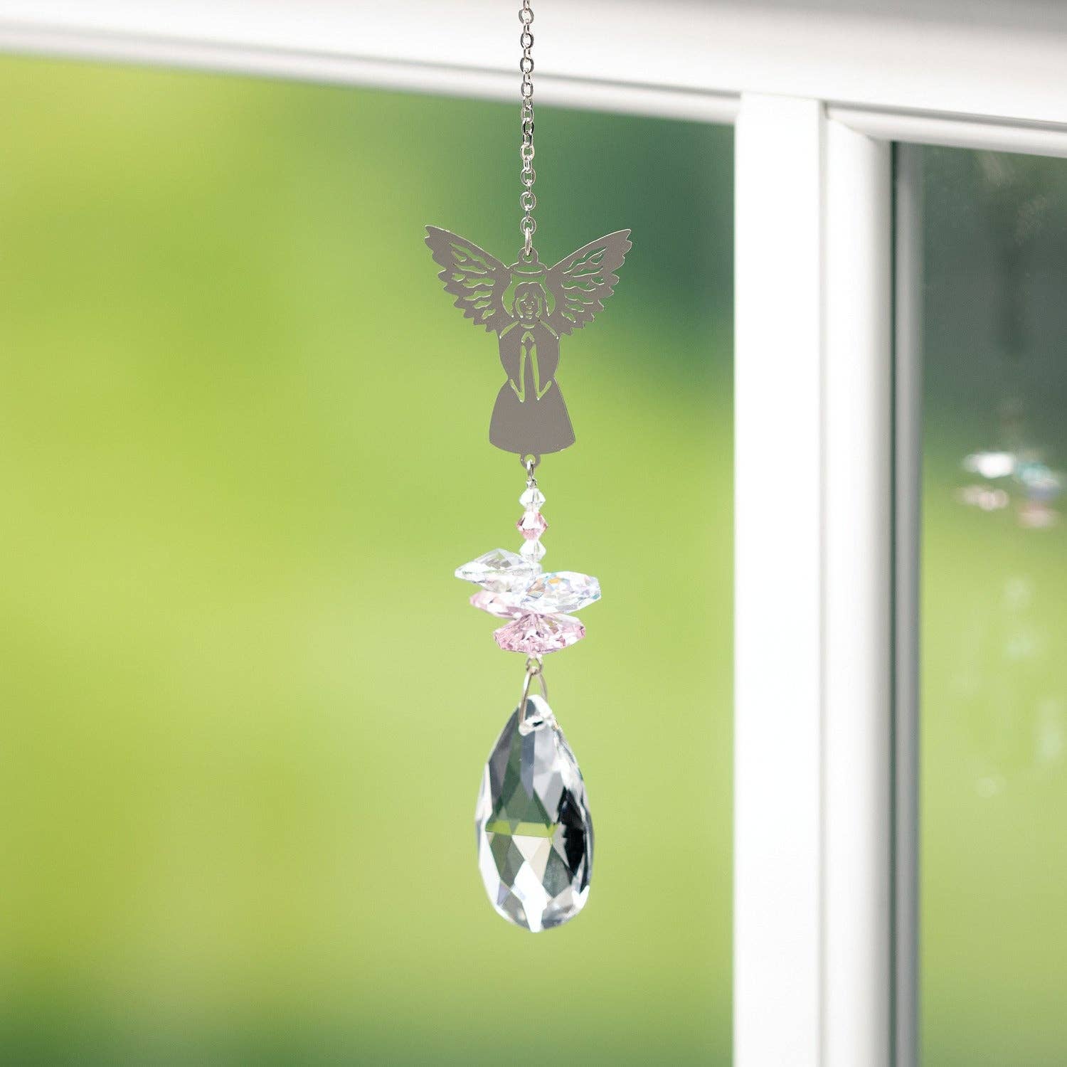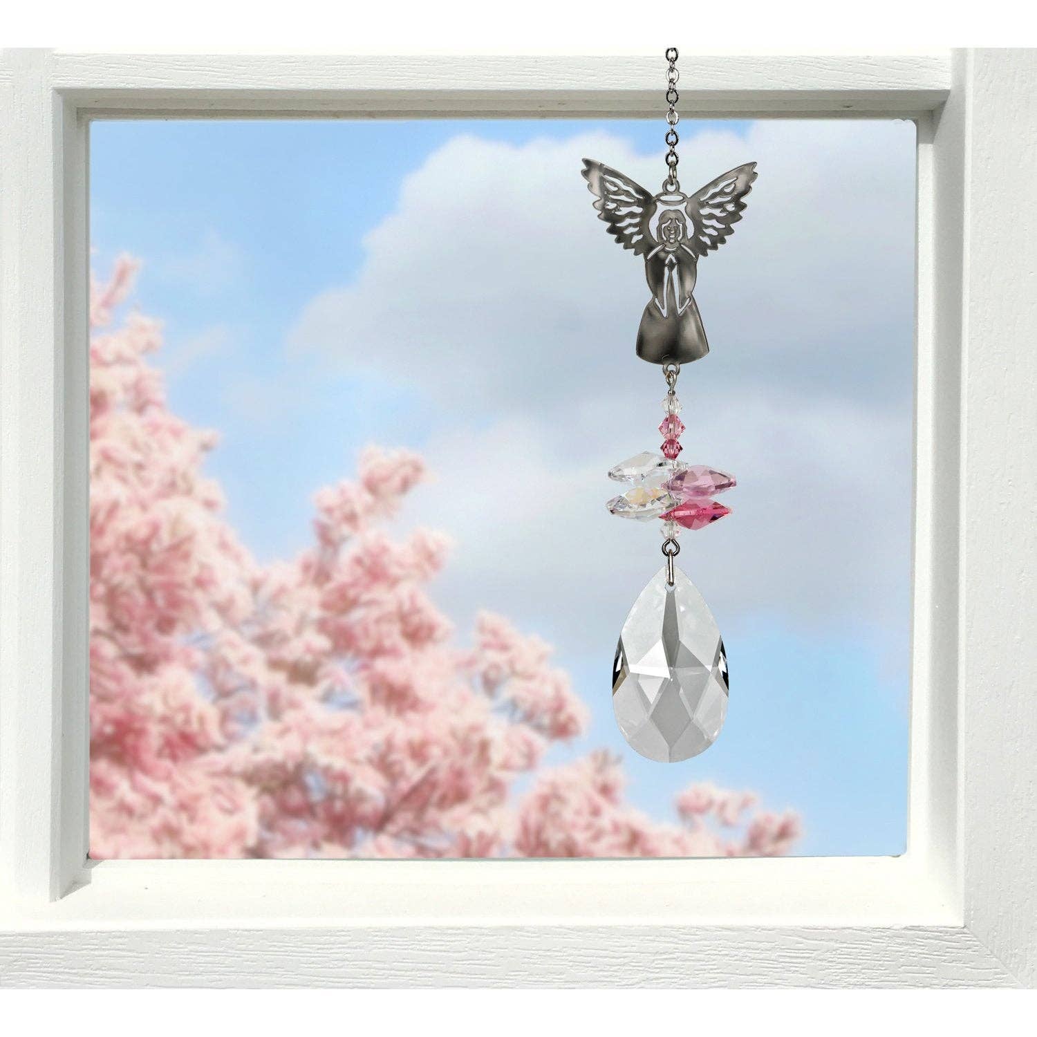A large crystal is topped by smaller crystals and a silver angel. You deserve an angel of your very own. This one tops a cluster of crystals that sparkle and shine in the sun.
