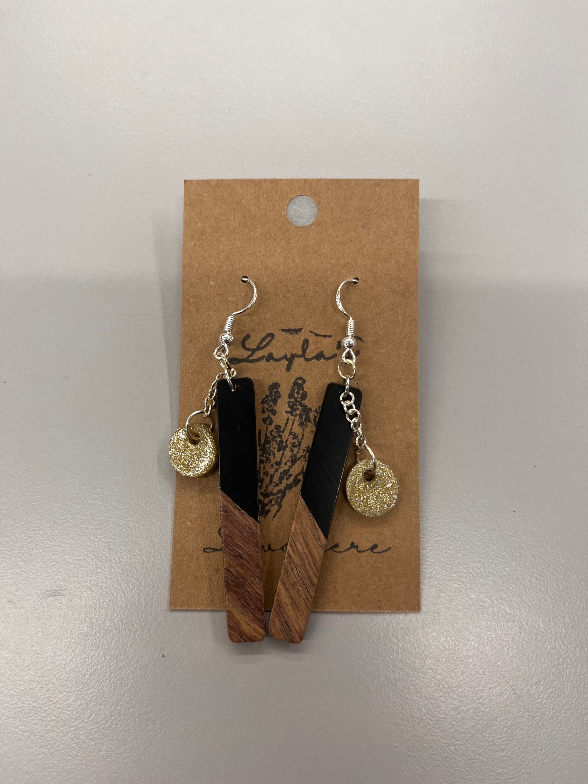 Earrings with long wooden charms and clay circles components by Layla's Lavaliere