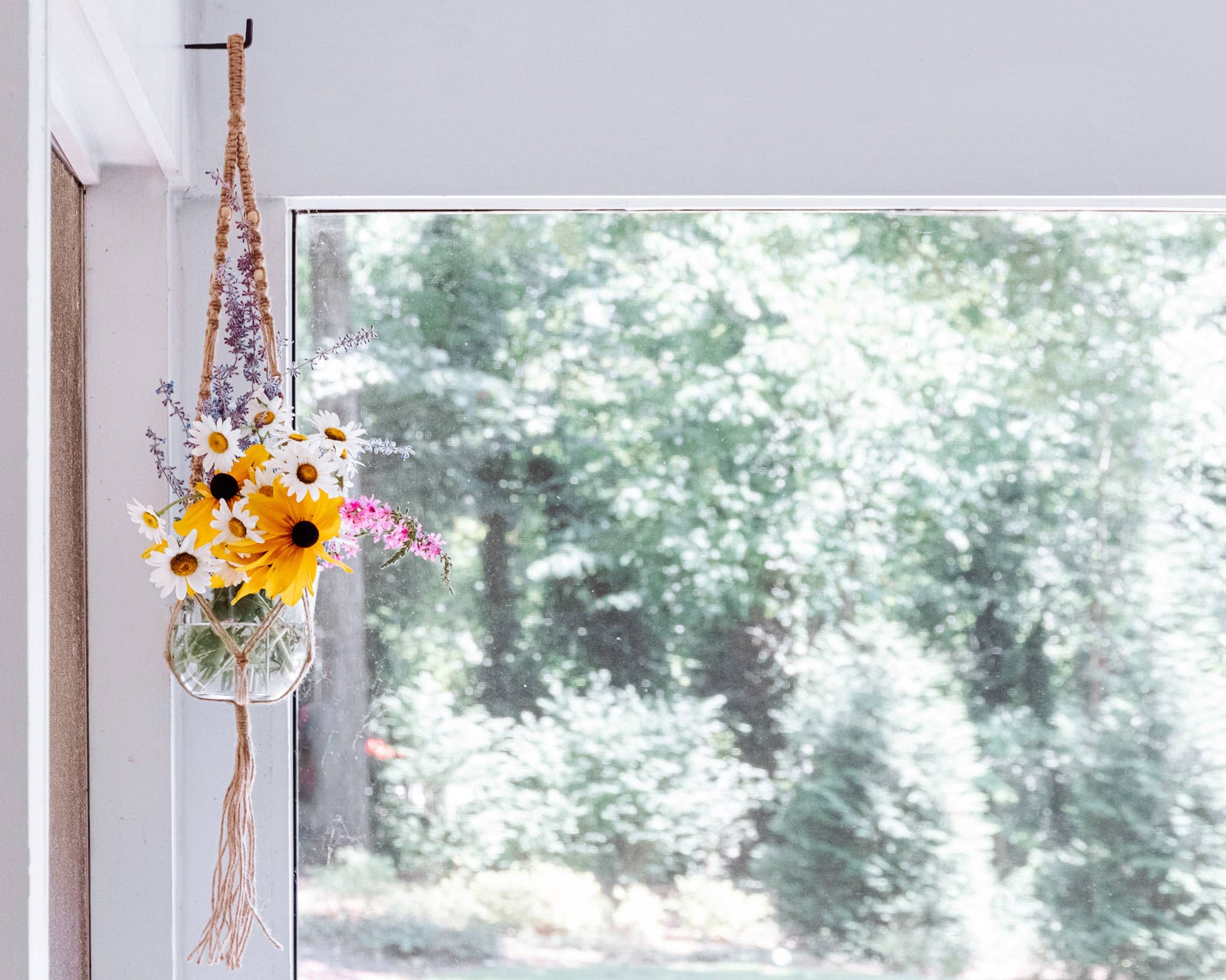 This macrame hanging glass flower pot is perfect for showcasing stems from your garden!