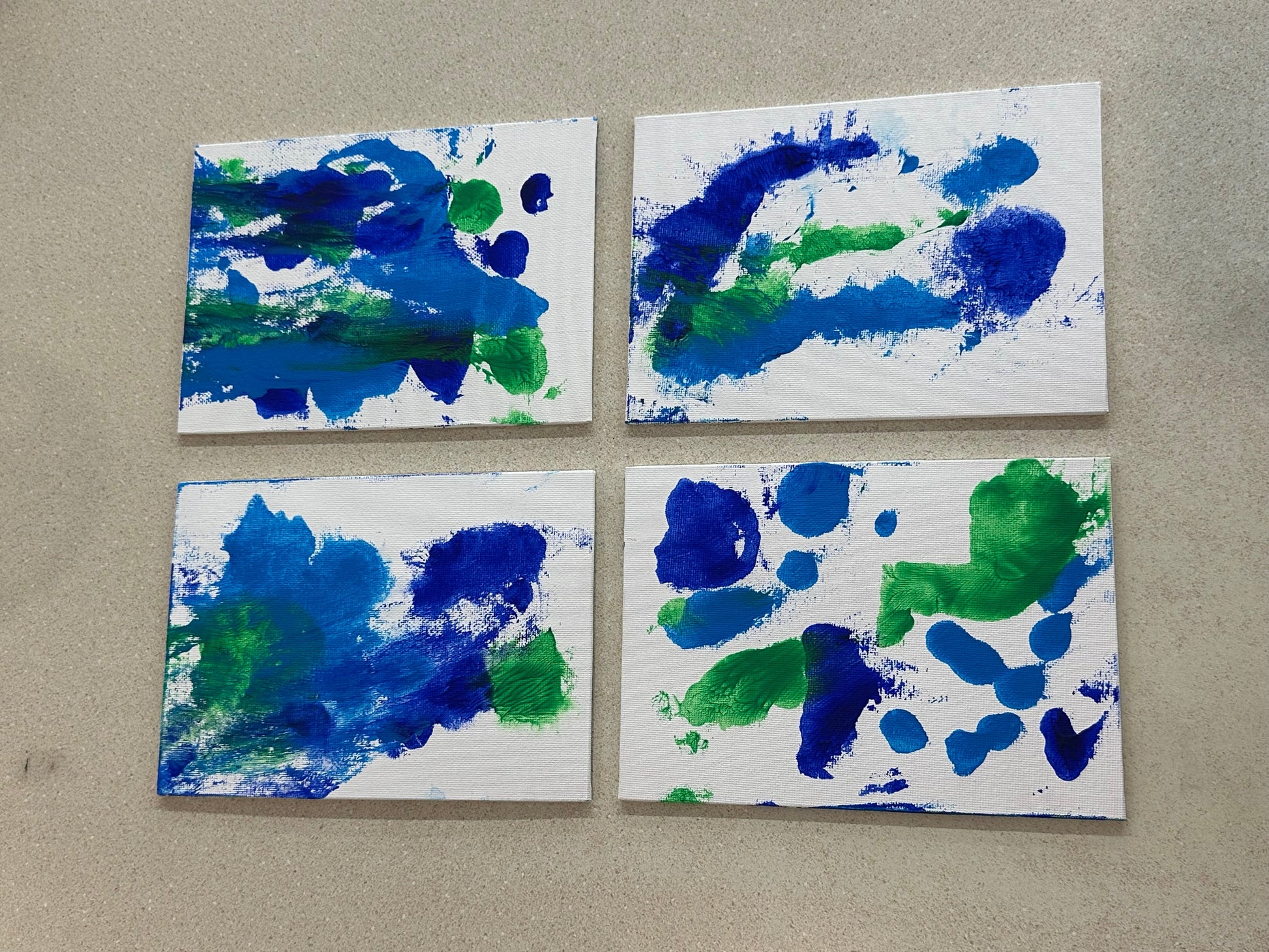 We've created a safe environment for Rafael to paint, where he doesn't come in contact with any chemicals. He walks across dabs of paint UNDER saran wrap, to create abstract pieces.