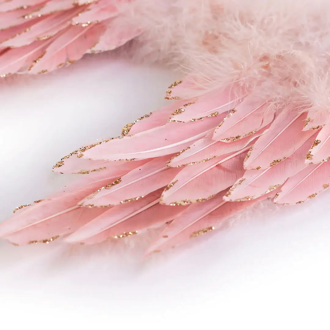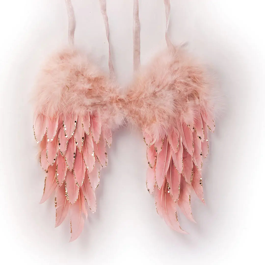 Elegant Rose Gold Angel Wing Christmas Ornament made with feathers that have been tipped with golden glitter. With it's sparkling details, these pink Christmas ornaments are a must have this holiday season. Available in two sizes. With matching pink Christmas trees, wreaths and garlands, you can shop the entire Sparkling Holiday Collection of pink Christmas decorations. Pair them together or showcase them separately, complementing your table setting & home interiors. Great for giftwrapping and gift giving too!