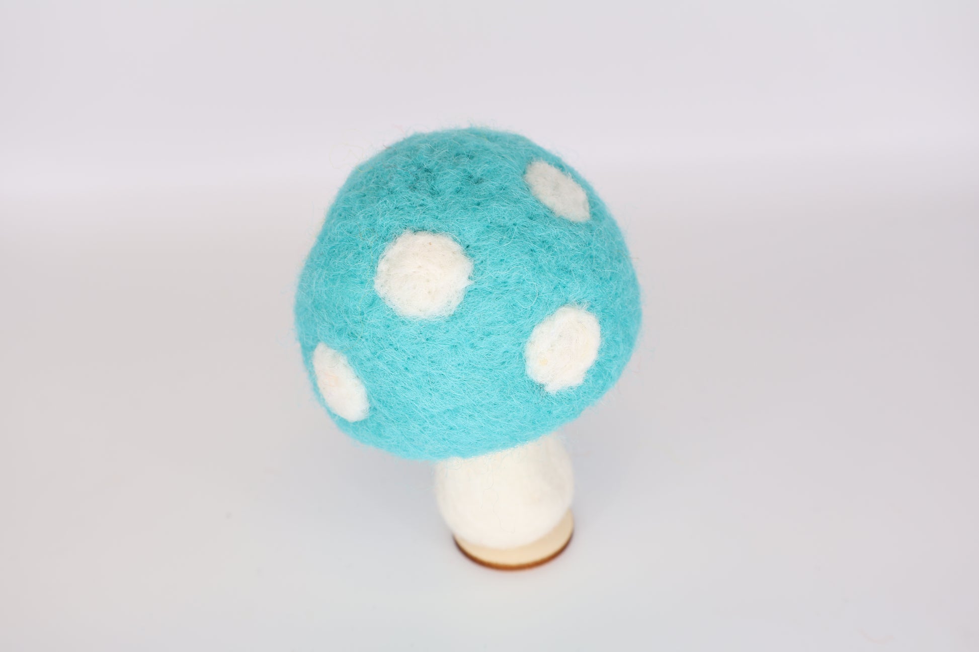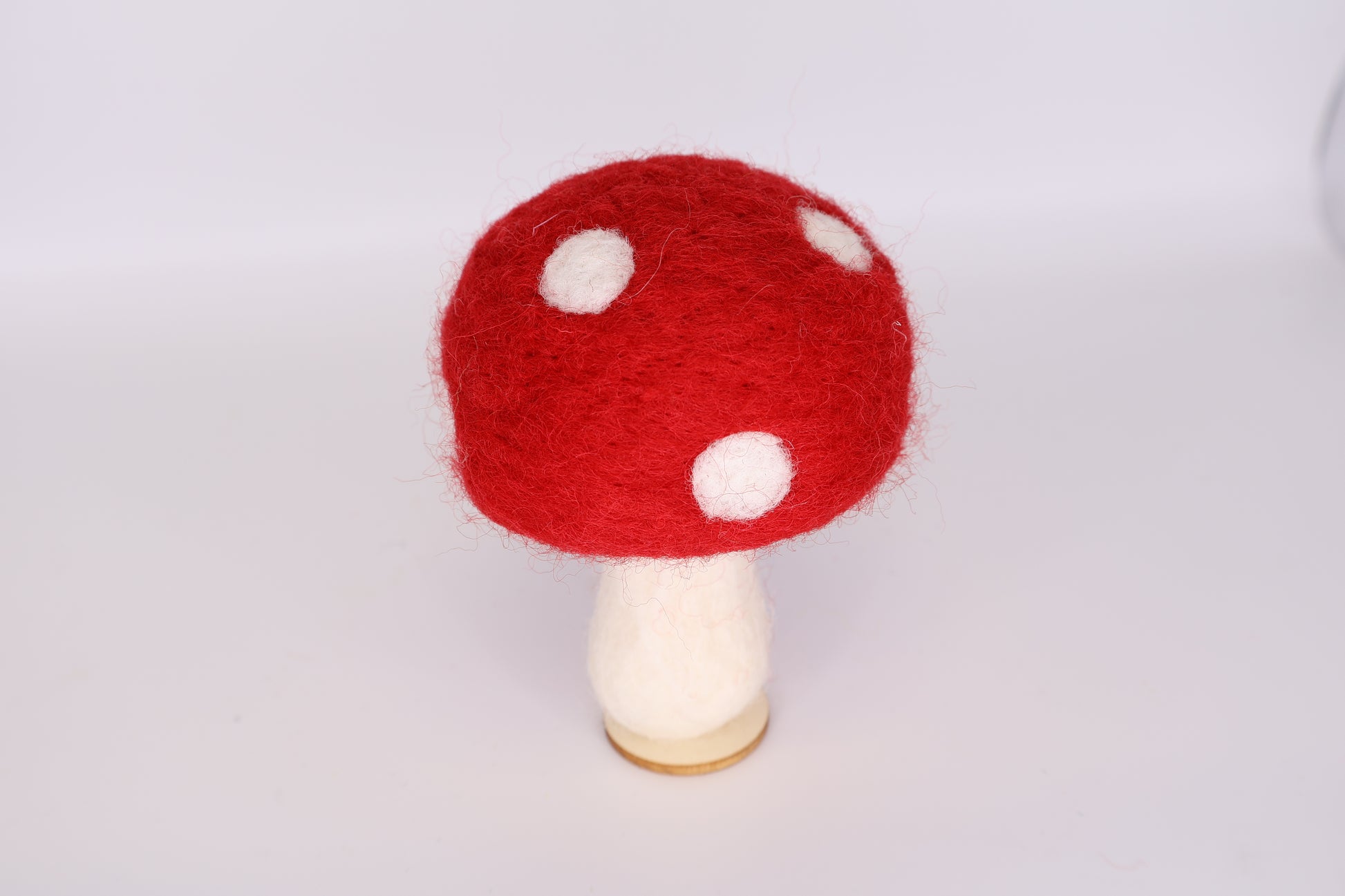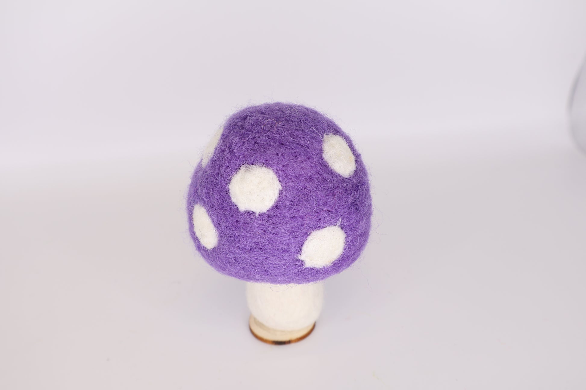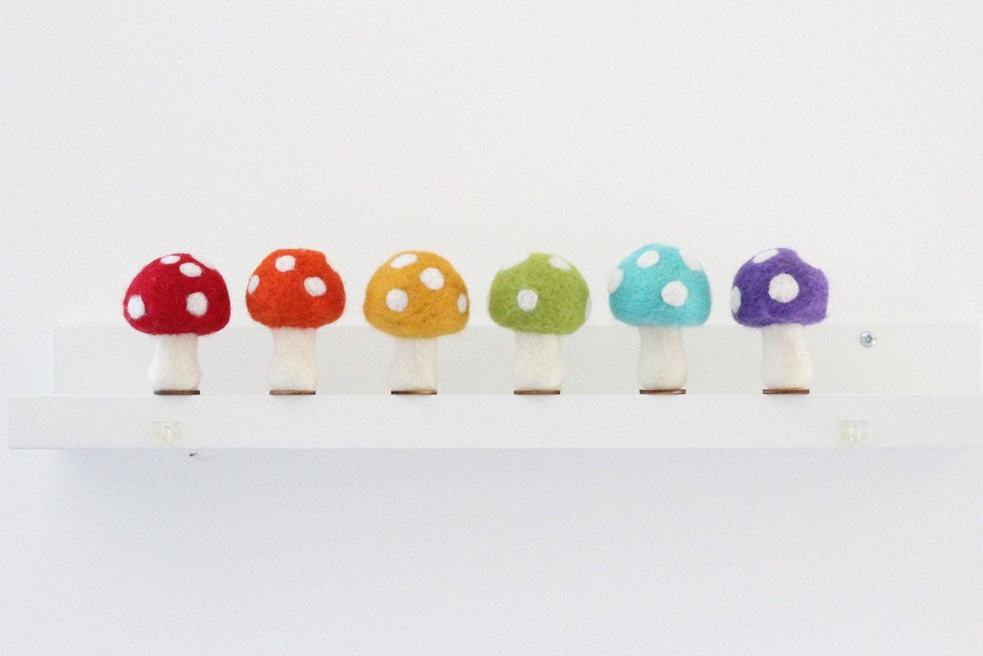 Rainbow felted mushrooms. Stands 3.25 inches high on wooden base. Comes in colors red, orange, yellow, green, teal, and purple.