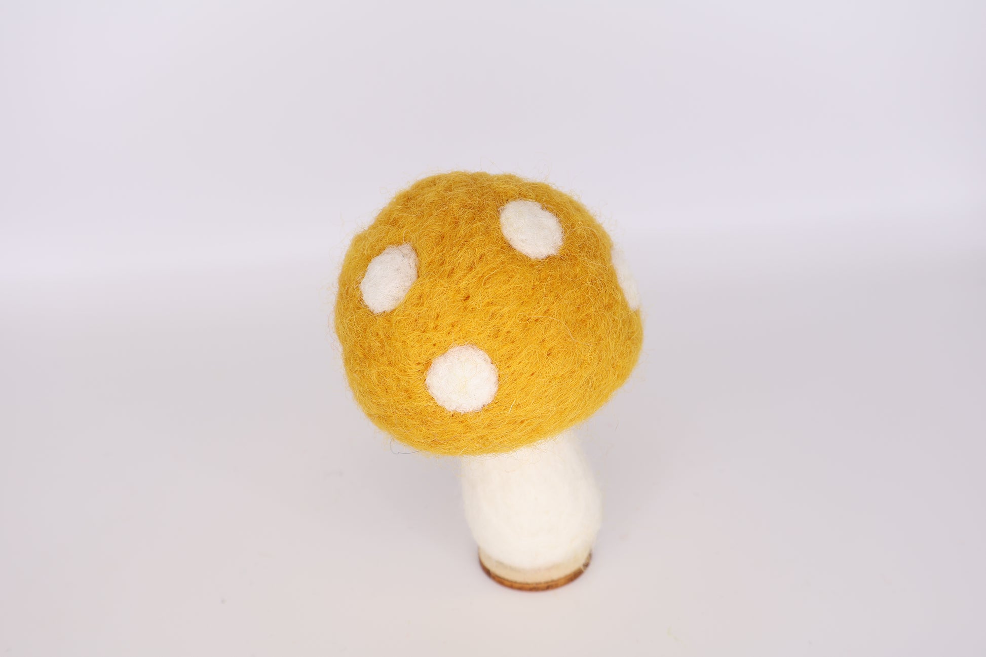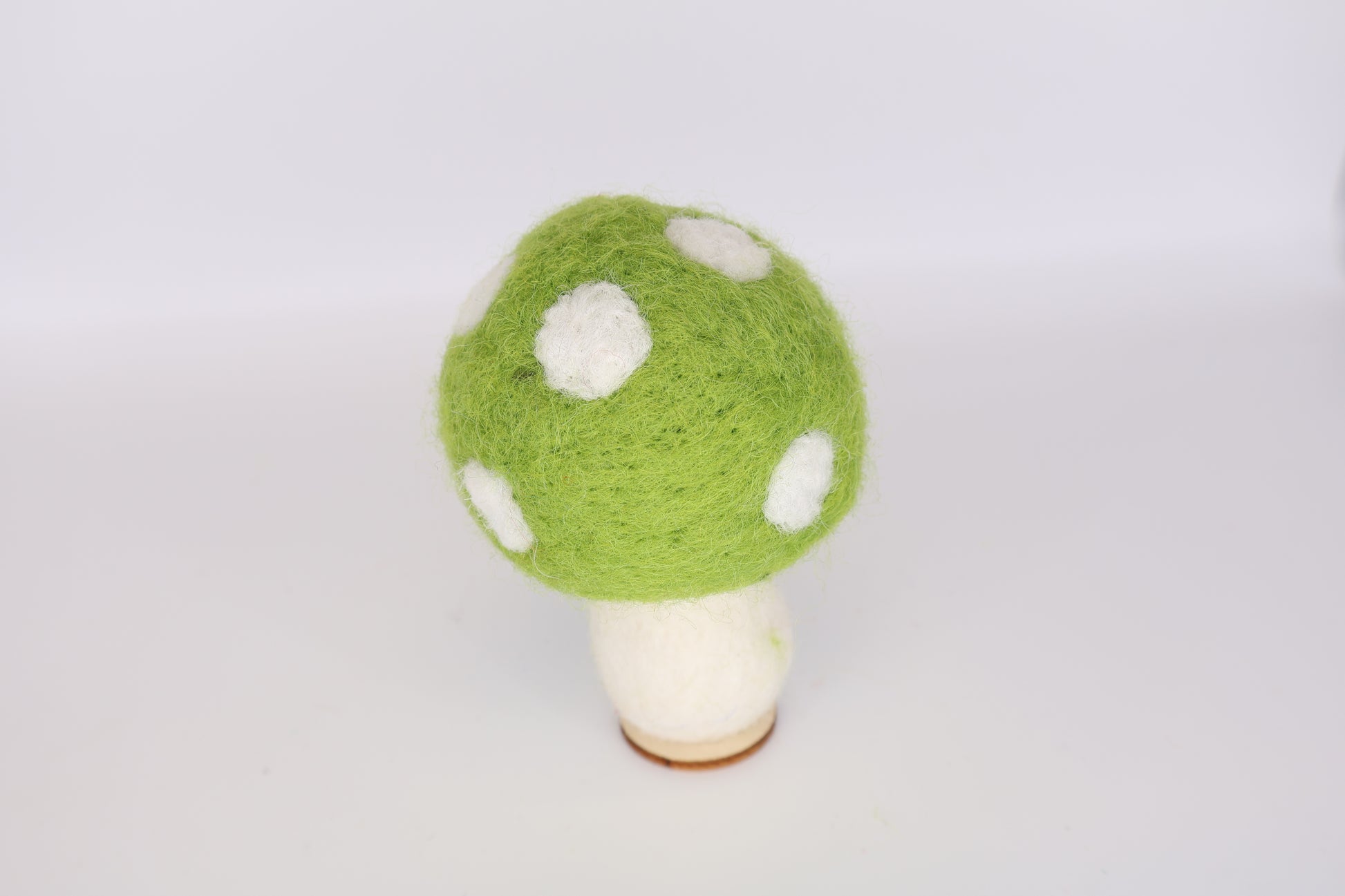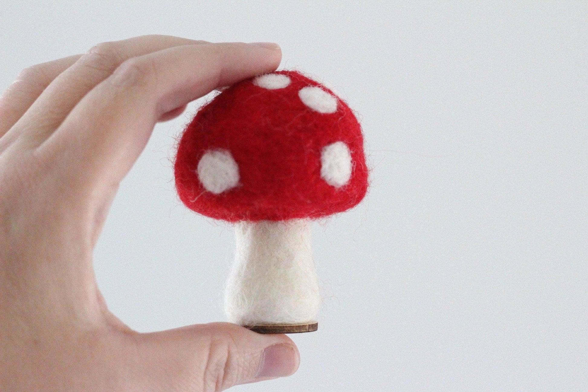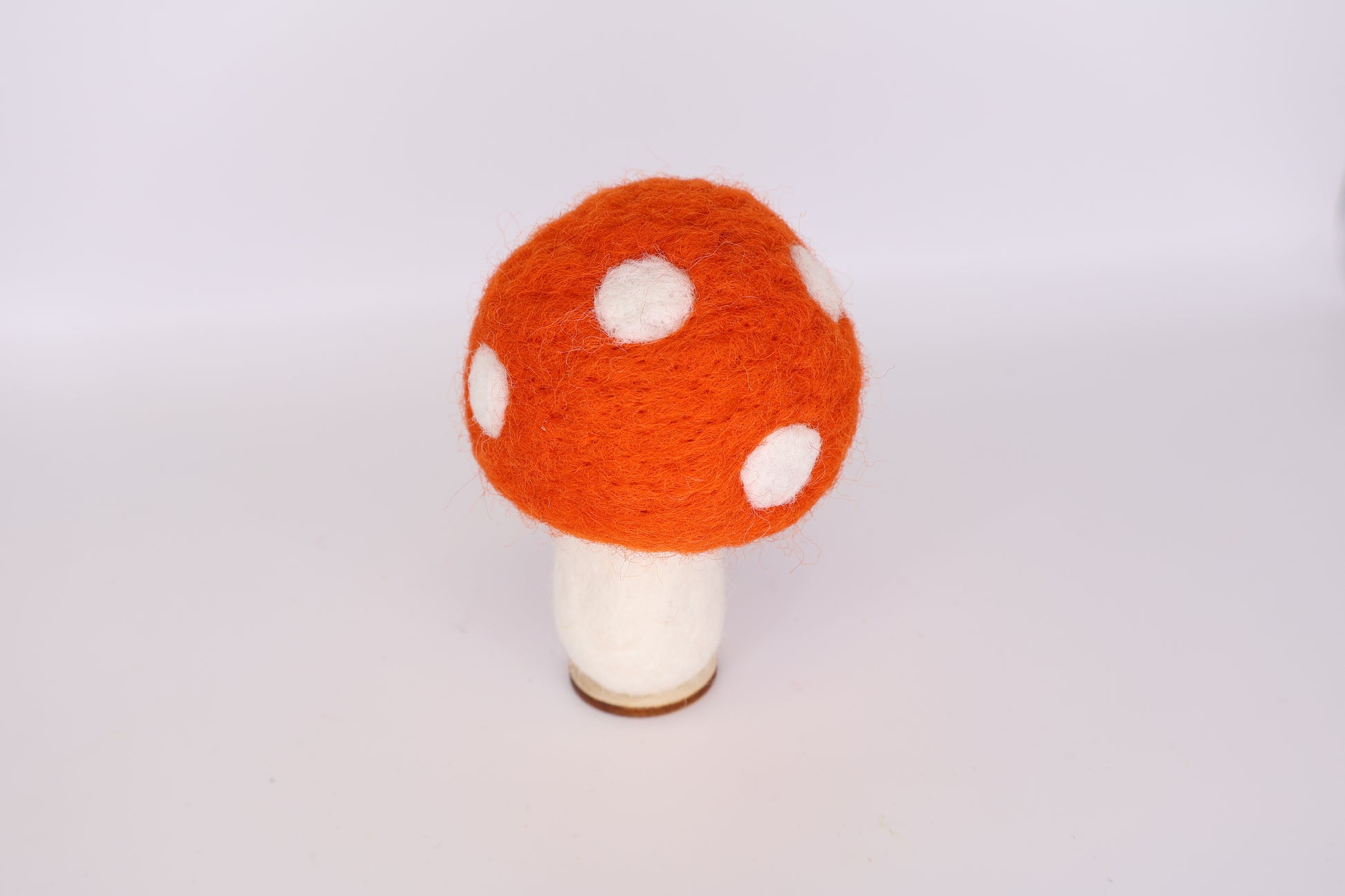 Rainbow felted mushrooms. Stands 3.25 inches high on wooden base. Comes in colors red, orange, yellow, green, teal, and purple.