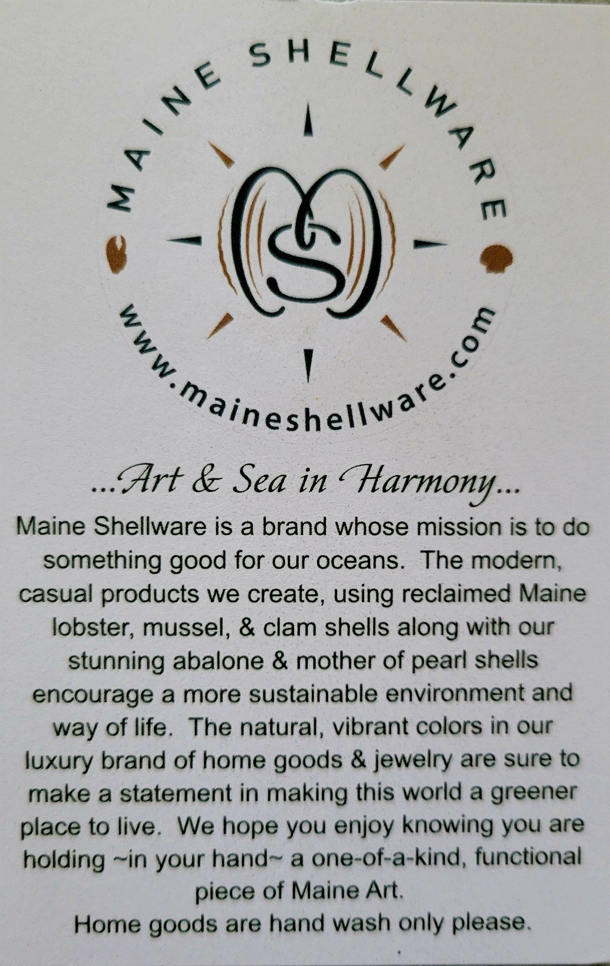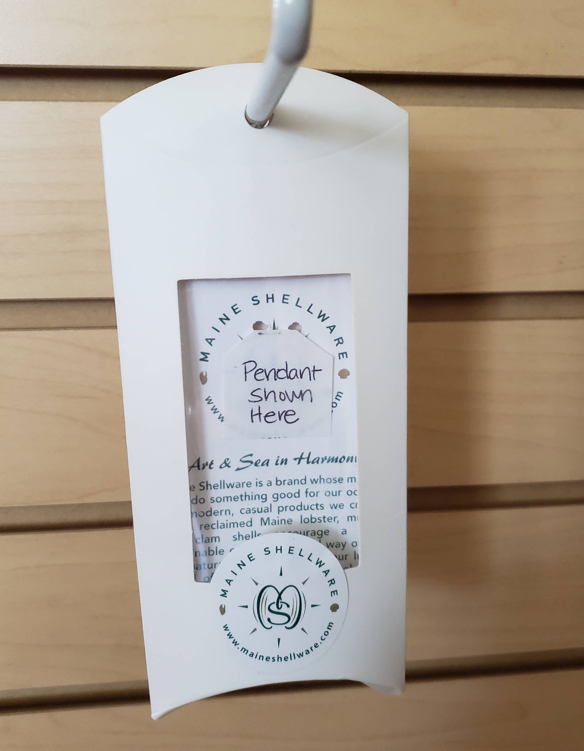 This pendant is available in limited crushed shell colors and attached on a product card and includes a 20" sterling silver chain, slid into our white sleeve with clear window package for hanging.