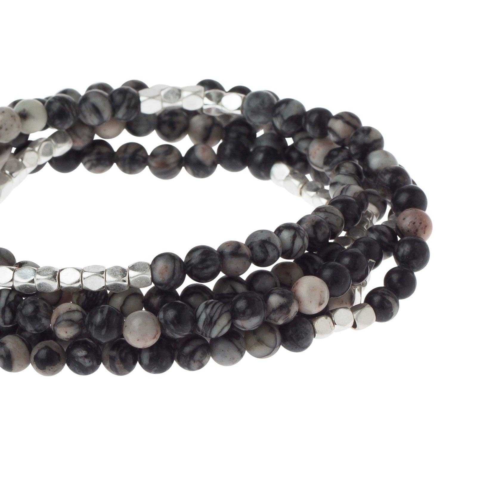 Tap into the energies of the earth. Semi precious gemstones adorn wrist & neckline. Effortlessly converts from bracelet to necklace. Can be wrapped 4-5 times as a bracelet and 1-2 times as a necklace.